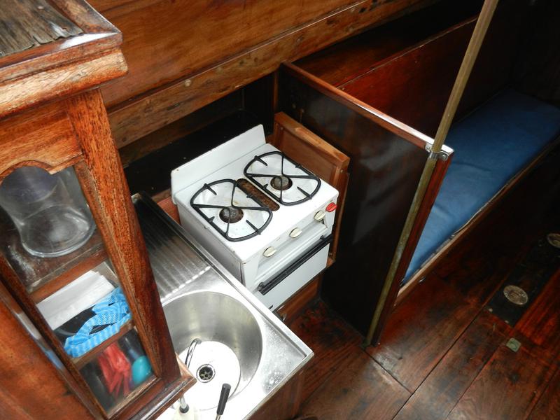 Galley to port with a two burner gas cooker with grill and oven, stainless steel sink with hand pump tap.